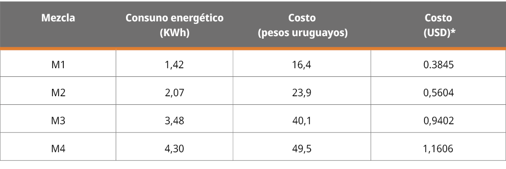 La estimación de costo del proceso se cuantificó teniendo en cuenta únicamente el consumo de energía eléctrica debido a la resistencia del rector, lo consumido por el compresor de aire y lo consumido por diferentes componentes electrónicos. Para cuantificar la energía eléctrica consumida por la resistencia y el compresor en los experimentos, se instalaron dos medidores comerciales de energía consumida (con una apreciación de 0.1 kWh), uno a la entrada del compresor y otro a la de la resistencia. Se registran los valores antes y después de cada experimento. Durante la preparación de las muestras se utilizó una mezcladora cuyo gasto energético fue menor a la precisión del medidor (0.1 kW), por lo que se despreció en el cálculo final. Adicionalmente se tomaron como valores de consumo de la PC de escritorio (HP), monitor (LG) y datalogger como 180, 41 y 10 W, respectivamente. Finalmente, se contabilizaron las horas de duración de cada experimento y se calculó el gasto energético en kWh. Para el cálculo del consumo en pesos uruguayos se tomó el pliego tarifario de UTE (Administración Nacional de Usinas y Trasmisiones Eléctricas) en el momento de realización de los experimentos, conociendo que el Polo tecnológico de Pando tiene un contrato eléctrico como mediano consumidor, y considerando el mayor costo posible (funcionamiento en horario de punta, en tarifa MC1).