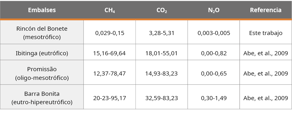 Abril, G., Guerin, F., Richard, S., Delmas, R., Galy-Lacaux, C., Gosse,P., Tremblay, A., Varfalvy, L., Dos Santos, M. y Matvienko, B., 2005. Carbon dioxide and methane emissions and the carbon budget of a 10-year old tropical reservoir (Petit Saut, French Guiana). En: Global Biogeochemical Cycles, 19, GB4007. DOI: https://doi.org/10.1029/2005GB002457