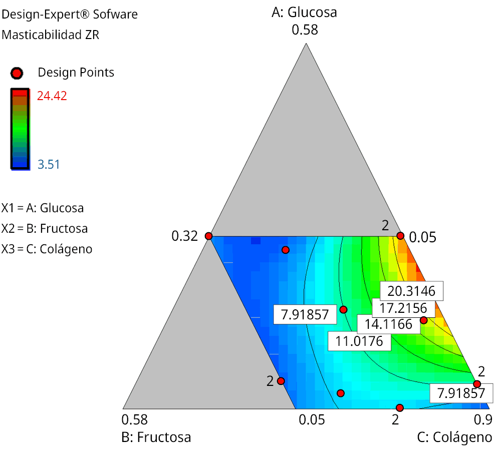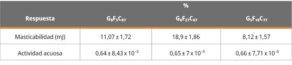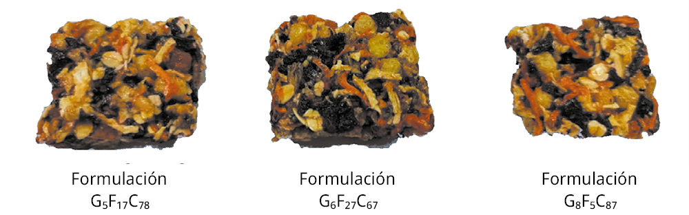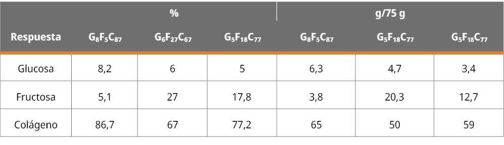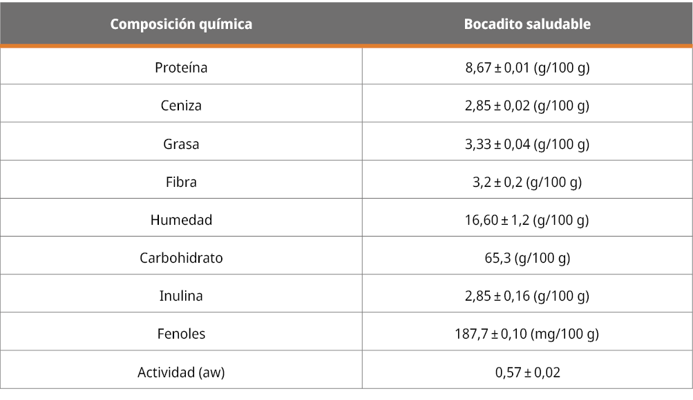 Recientemente en Argentina han incrementado de manera considerable los casos de diabetes mellitus (tipo 2) en adultos debido al sobrepeso, la obesidad y el sedentarismo. Esto ha generado un mayor interés por los alimentos funcionales que brindan beneficios a la salud debido a su aporte de pre y probióticos, antioxidantes, fibras y grasas saludables, entre otros. En este trabajo se elaboró un bocadito saludable con tubérculos, cereales y semillas que aportan fibras solubles y no solubles, inulina que actúa como antiglucemiante, fenoles que son antioxidantes y una mezcla de fructosa, glucosa y colágeno como ligante de todos los ingredientes. La composición óptima del aglutinante se determinó mediante un diseño experimental de mezcla con restricciones (Design Expert), manteniendo el resto de los componentes constantes. Se restringió el contenido máximo y mínimo de glucosa y fructosa a efectos de obtener la mayor proporción de colágeno manteniendo una masticabilidad aceptable. Se prepararon los bocaditos y se optimizó su formulación mediante análisis de textura. En base a las respuestas obtenidas surgieron tres posibles formulaciones, se elaboraron los bocaditos y se realizó un análisis sensorial. Se detectó uno de mayor aceptabilidad y se procedió a su análisis químico.