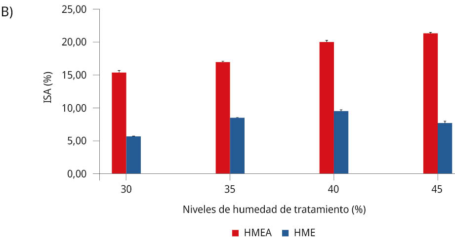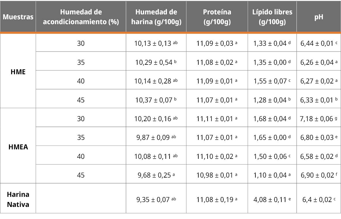 El objetivo de este trabajo fue estudiar las propiedades tecnofuncionales de la harina de maíz cuzco extrudida alcalina (HMEA), obtenida por el agregado de Ca(OH)2 en el proceso de extrusión, y compararla con las de una harina de maíz obtenida por un proceso de extrusión tradicional (HME). La harina nativa se acondicionó a humedades de 30, 35, 40 y 45% (p/p) y fue extrudida en un extrusor monotornillo a 80 °C. Para la extrusión alcalina