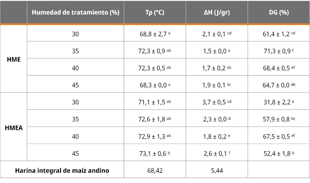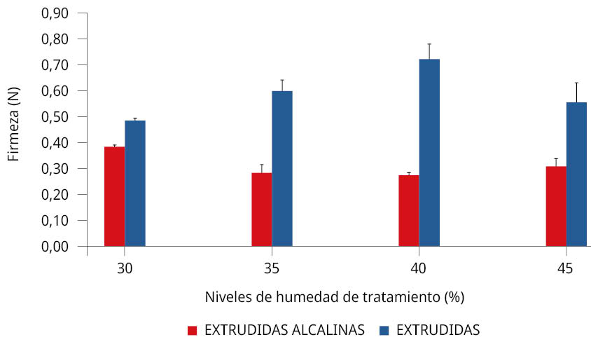 se adicionó 0,25 g de Ca(OH)2 /100 g de harina. El agregado de Ca(OH)2 en el proceso de extrusión afectó significativamente las propiedades tecnofuncionales de la HMEA, aumentando el índice de solubilidad (ISA), y disminuyendo el índice de absorción de agua (IAA) y la capacidad de retención de aceite (CRA) respecto a la HME. El tratamiento alcalino disminuyó el grado de gelatinización respecto a la HME, obteniendo valores entre 31,80 y 57.90% y aumentando la temperatura de gelatinización de 69 a 73 °C. La firmeza de los geles varió de 0,26 a 0,33 N para HMEA, y de 0,50 a 0,77 N para HME. La extrusión alcalina modificó las propiedades tecnofuncionales de la harina de maíz cuzco, disminuyendo la absorción de agua y controlando el grado de gelatinización, obteniéndose harinas con grado de cocción intermedio.