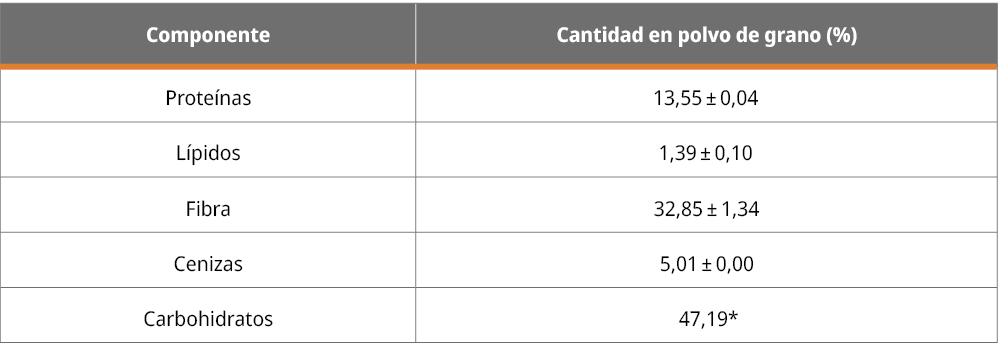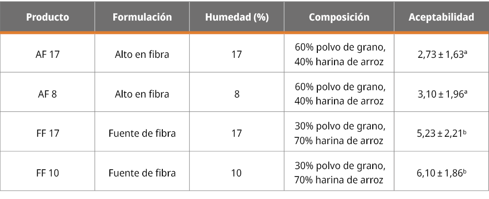 El objetivo de este trabajo fue revalorizar y encontrarle un uso para consumo humano a un subproducto del proceso de elaboración de cerveza industrial, contribuyendo así al desarrollo de la economía circular. El polvo de grano es un subproducto obtenido durante la elaboración industrial de cerveza, y consiste en una mezcla de maíz y cebada en una proporción no definida. Se realizó la caracterización proximal del polvo de grano seguido del desarrollo de un producto mediante la tecnología de extrusión. Respecto a la caracterización proximal se destacó su alto contenido de fibra. El desarrollo de productos (snacks) se realizó teniendo en cuenta el contenido de fibra para alcanzar los claims “fuente de fibra” y “alto en fibra” en su etiquetado, según el reglamento del MERCOSUR. Se utilizó un extrusor simple tornillo (velocidad constante de 150 rpm, temperatura constante de 130 ℃), variando la humedad de la mezcla y la proporción de ingredientes adicionales para lograr la mayor aceptabilidad de los consumidores. El snack extruido de mayor aceptabilidad se comparó con dos cereales del mercado. Se logró obtener un producto listo para consumir utilizando un subproducto