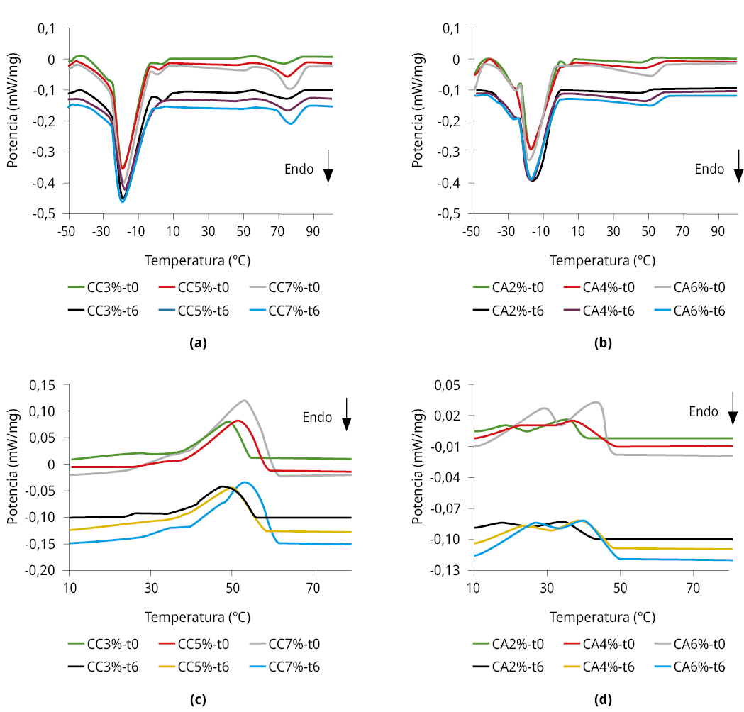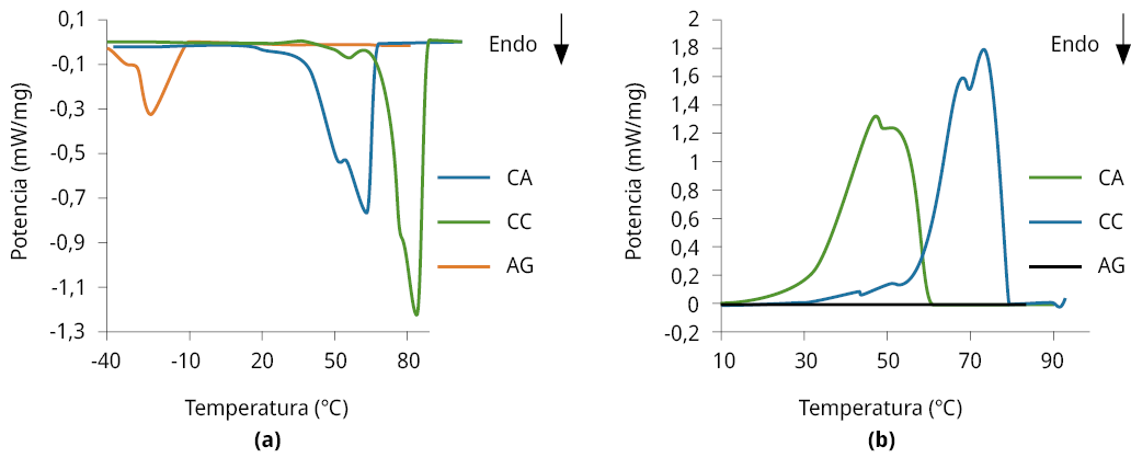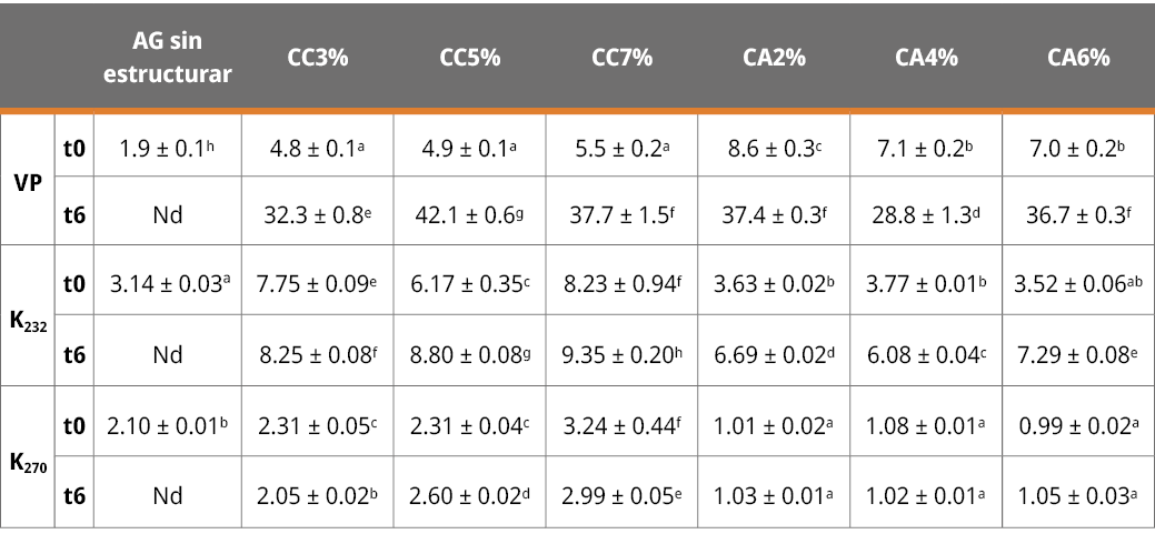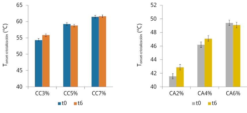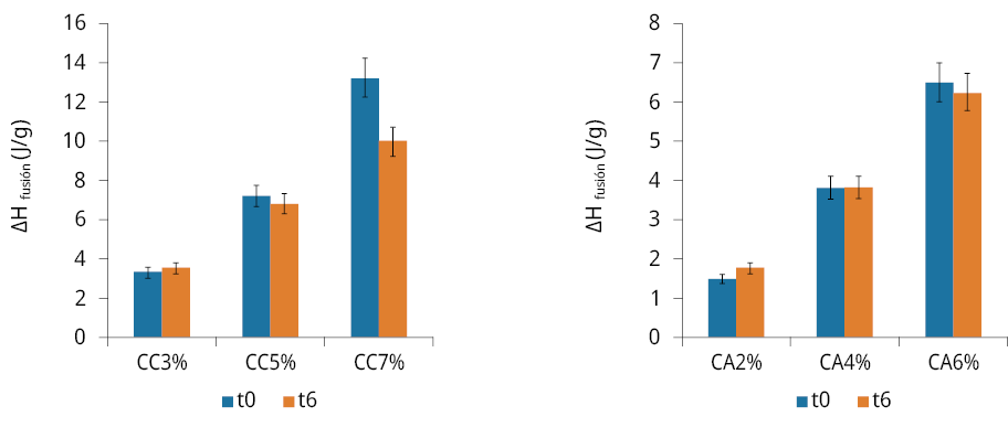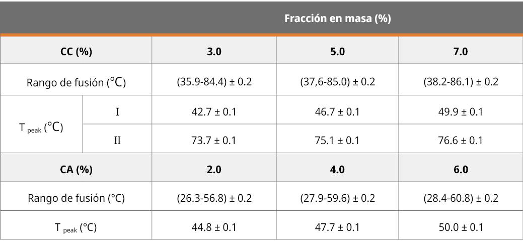 Los oleogeles son especialmente importantes ya que pueden ser empleados como reemplazo de materiales grasos para uso alimentario, aunque su utilización queda condicionada por su vida útil. En este marco, se estudiaron las propiedades térmicas de los oleogeles de aceite de girasol común (AG) con ceras de abeja (CA) y de carnauba (CC) como estructurantes, a distintas concentraciones, por calorimetría diferencial de barrido, y el deterioro oxidativo a temperatura ambiente en función del tiempo de almacenamiento. De acuerdo con los termogramas de fusión de los oleogeles, el aumento de la concentración de estructurante provocó un incremento en las temperaturas de pico. Los rangos asociados a la temperatura de desestructuración variaron entre 26.3 y 60.8 °C, y, 35.9 y 86.1 °C, mientras que las entalpías correspondientes variaron desde 1.5 a 6.5 J/g y 3.3 a 13.3 J/g para las ceras CA y CC, respectivamente. Los resultados de los parámetros asociados al deterioro oxidativo de los oleogeles con CC fueron los más elevados. Ello indica que los oleogeles con CA tienen una mayor resistencia a la oxidación y, por ende, mayor estabilidad oxidativa. En conclusión, los oleogeles estudiados solo podrían ser utilizados en alimentos con una vida útil menor a 6 meses.