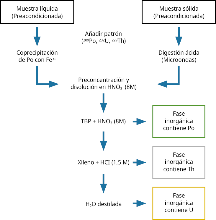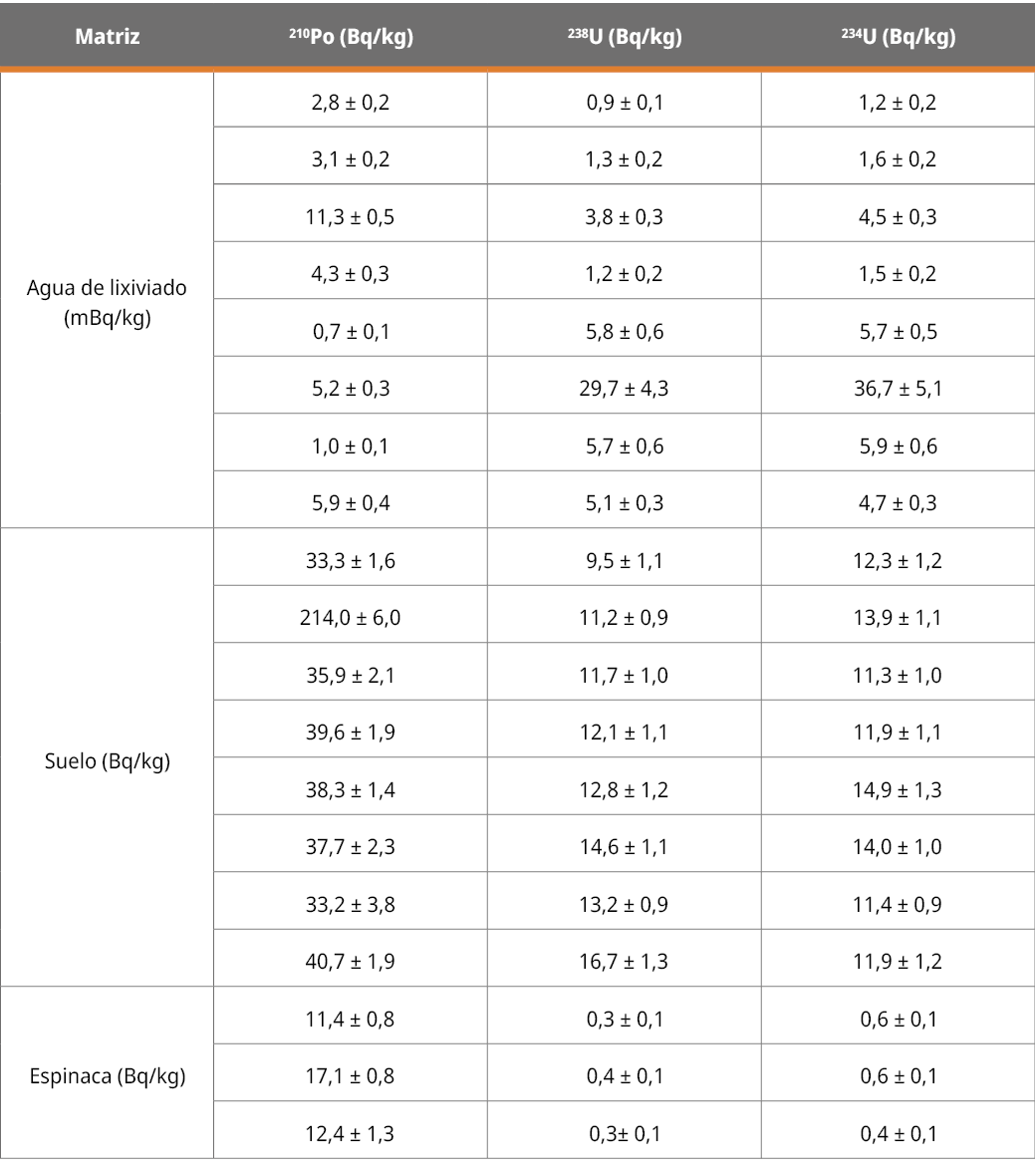 La roca fosfórica, materia prima utilizada para producir fertilizantes, puede ser fuente de metales, radionucleidos y otras trazas debido a su composición. La aplicación de fertilizantes fosfatados puede redistribuir y elevar las concentraciones tanto de metales como de radionucleidos en los perfiles del suelo y en aguas, influyendo en su disponibilidad y posterior transferencia a la cadena alimentaria. Conocer la proporción de dicha transferencia es fundamental por las implicaciones que puede tener sobre la salud humana y animal. Este trabajo estudia las condiciones de tratamiento de muestra, separación radioquímica y deposición o electrodeposición para la cuantificación de polonio-210, uranio-238 y uranio-234 por espectrometría alfa para un sistema agrícola uruguayo. Ambos procesos requieren optimización para cada tipo de matriz a fin de evitar el efecto de autoabsorción, así como posibles interferencias de otros radionucleidos presentes en la muestra. El método fue verificado mediante la cuantificación de polonio-210, uranio-238 y uranio-234 en materiales de referencia del Organismo Internacional de Energía Atómica (IAEA): suelo IAEA-447, fosfoyeso IAEA-434, espinaca IAEA-330. Los radionucleidos fueron cuantificados en matrices ambientales y los resultados se compararon con los obtenidos por Espectrometría de Masas con Plasma Acoplado Inductivamente (ICP-MS), mostrando resultados comparables e indicando que la separación radioquímica desarrollada es adecuada para la determinación de los radionucleidos de uranio y polonio por espectrometría alfa en las matrices estudiadas.
