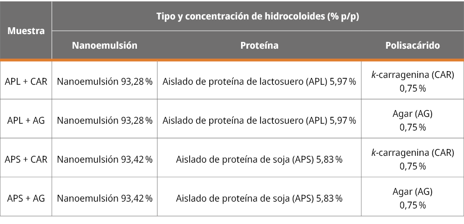 Debido al aumento de la población mayor (>60 años), la industria alimentaria tiene el desafío de diseñar alimentos para este grupo etario considerando los cambios deglutorios que ocurren producto del envejecimiento. Por ello, el objetivo de este trabajo fue evaluar el efecto de diferentes mezclas de hidrocoloides en las propiedades físicas de geles basados en nanoemulsiones. Se prepararon 4 muestras utilizando una nanoemulsión base (194 nm) con diferentes mezclas de agentes gelificantes: 5,25% APS-Aislado de proteína de soja o APL-Aislado de proteína de lactosuero y 0,75% AG-Agar o CAR-k-carragenina. Los geles se caracterizaron según sus propiedades ópticas, de flujo y textura. Los resultados mostraron que todos los geles tuvieron una coloración amarilla-beige, especialmente aquellos con APL. Por otro lado, todos los geles presentaron una leve caída de la viscosidad en el tiempo, lo cual facilitaría su deglución debido a una baja fluidificación. Además, la dureza de los geles fue <600 N/m2 considerándose adecuada para las necesidades deglutorias de las personas mayores. En conclusión, el uso de mezclas de hidrocoloides permite obtener geles basados en nanoemulsiones con propiedades de flujo y texturales adecuadas para una deglución fácil y segura, lo cual permitiría el desarrollo de alimentos adaptados a los requerimientos sensoriales de las personas mayores.