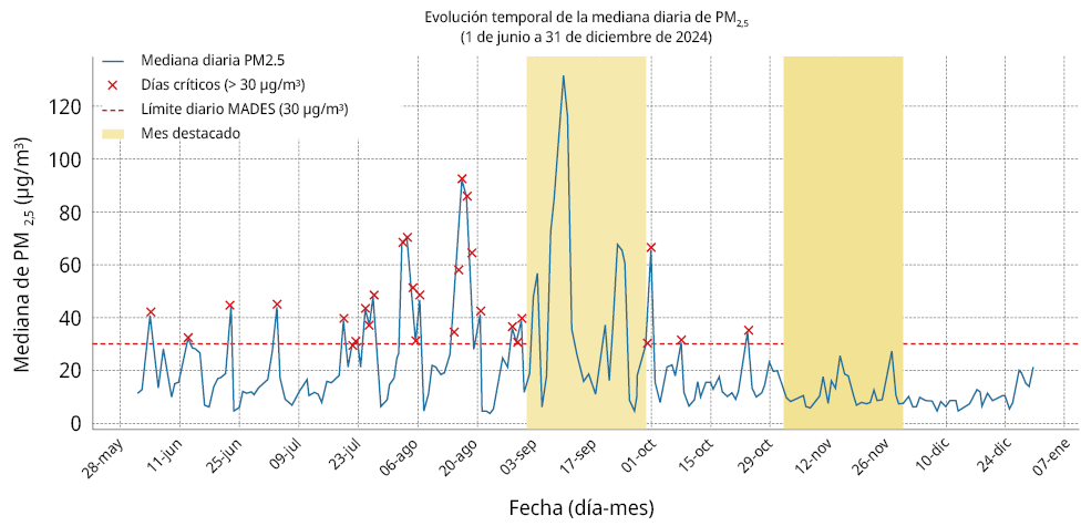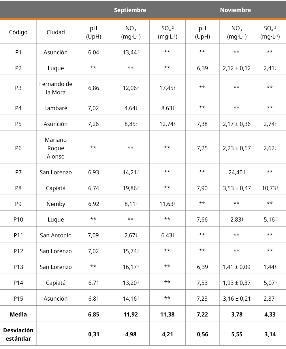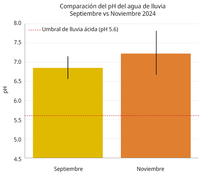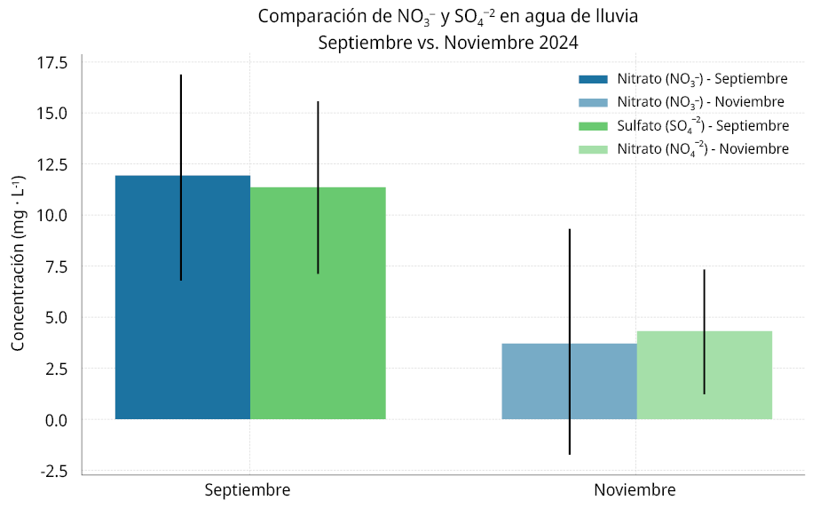 Los incendios forestales provocan efectos adversos significativos en áreas urbanas y rurales. El objetivo de este estudio fue evaluar la influencia de los incendios forestales sobre la composición química del agua de lluvia y la calidad del aire en el Área Metropolitana de Asunción, Paraguay. Se recogieron muestras de agua de lluvia en septiembre y noviembre de 2024. Se analizaron pH, nitrato (NO₃-) y sulfato (SO₄-2) mediante métodos estandarizados. La calidad del aire se analizó de junio a diciembre de 2024, mediante sensores semiprofesionales. Los resultados no indicaron indicios de lluvia ácida (pH < 5,6). En septiembre, las concentraciones de nitrato (11,92 ± 4,98 mg·L-¹) y sulfato (11,38 ± 4,21 mg·L-¹) fueron significativamente superiores (p < 0,05) a las registradas en noviembre (3,78 ± 5,55 mg·L-¹ y 4,33 ± 3,14 mg·L-¹), respectivamente, lo que sugiere una mayor presencia de precursores ácidos (NOₓ y SO₂) en la atmósfera durante el periodo afectado por el incendio. La calidad del aire mostró concentraciones elevadas de PM₂,₅, con picos críticos a principios de septiembre. Estos resultados subrayan la necesidad de una vigilancia atmosférica integrada y de políticas medioambientales específicas para mitigar los efectos de los incendios forestales en los ecosistemas urbanos y periurbanos.